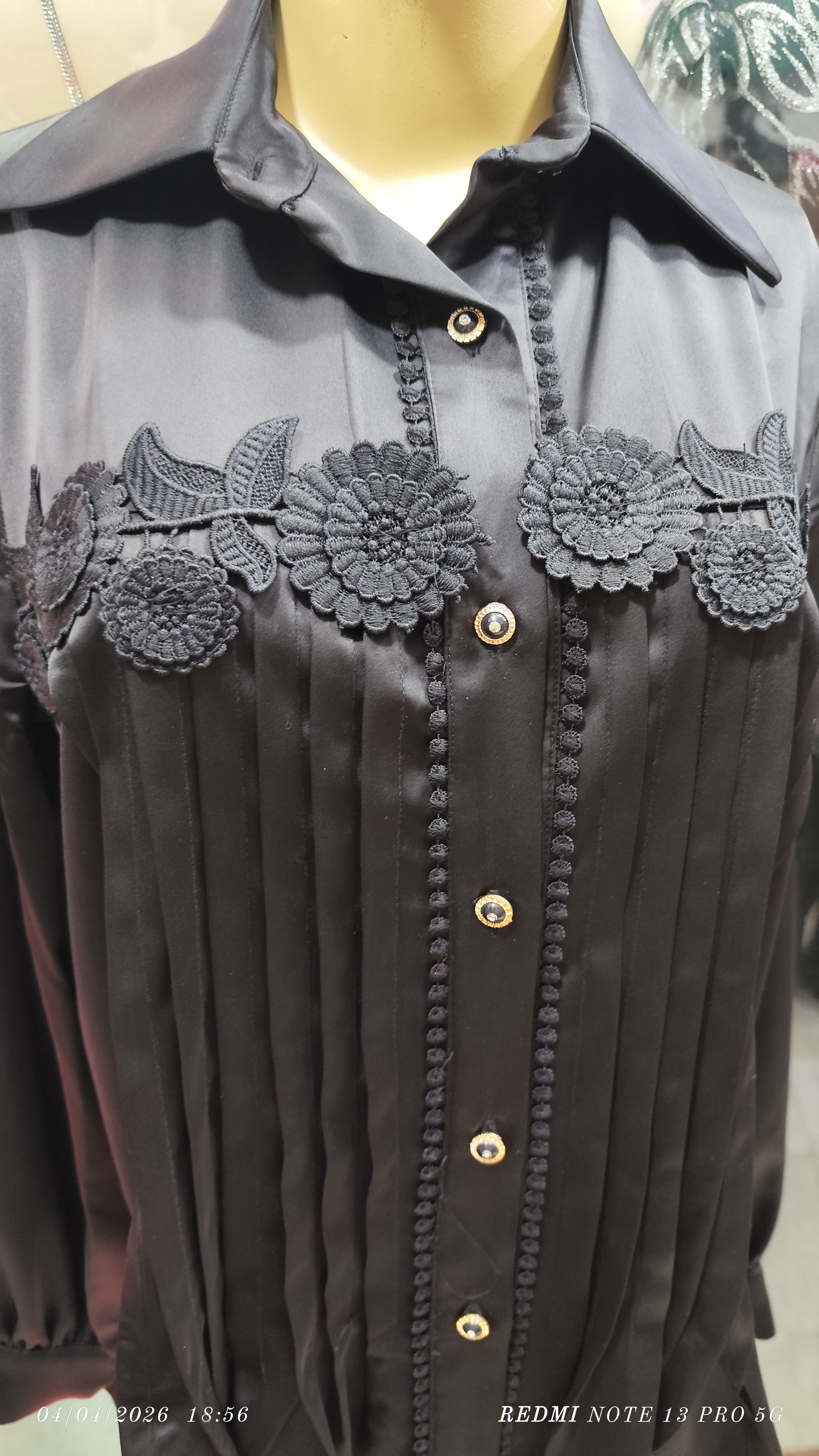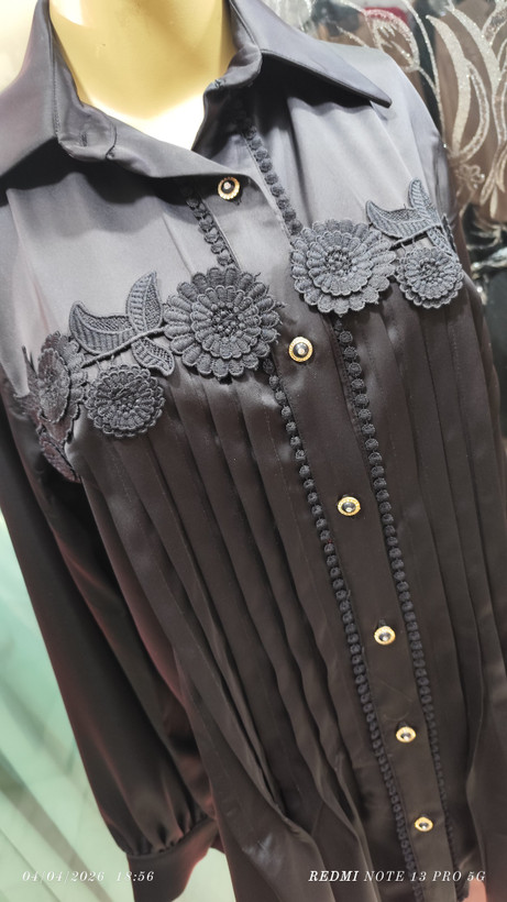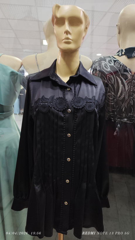 شومیز مجلسی دانتل ساتن یک شومیز زنانه زیبا که ترکیبی چشمنواز از پارچهی دانتل، و ساتن داشته و ظاهری مجلسی، ظریف و زنانه یافته است.فرم کلی بالاتنه اندامی بوده و به خوبی با دوخت ماهرانه، انحنای بدن را نشان میدهد. این امر به ظرافت و حالت مجلسی آن کمک میکند. قسمت بالاتنه و روی سینه از گل برجسته و دانتل نسبتاً ظریف تشکیل شده که طرحهای گُلدار و مختلف در بافت آن دیده میشود.