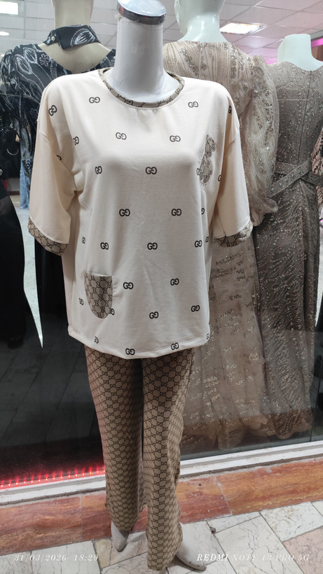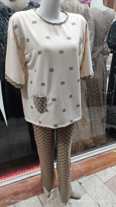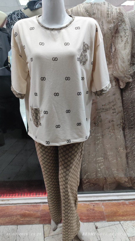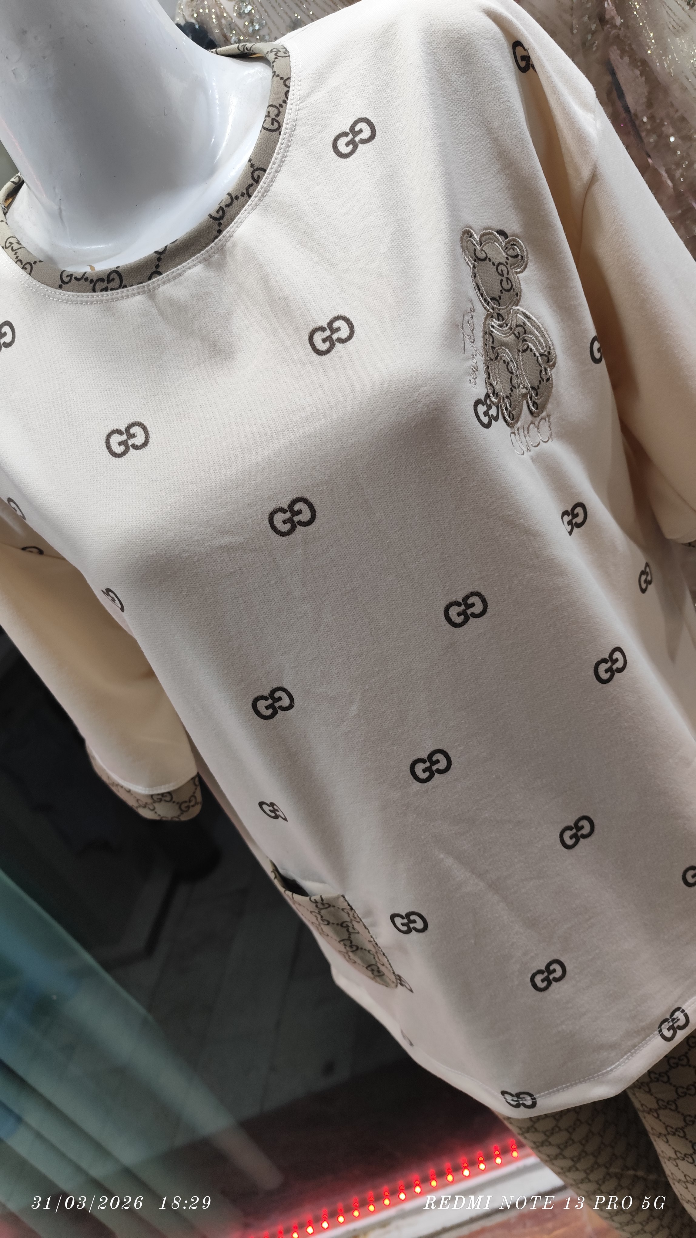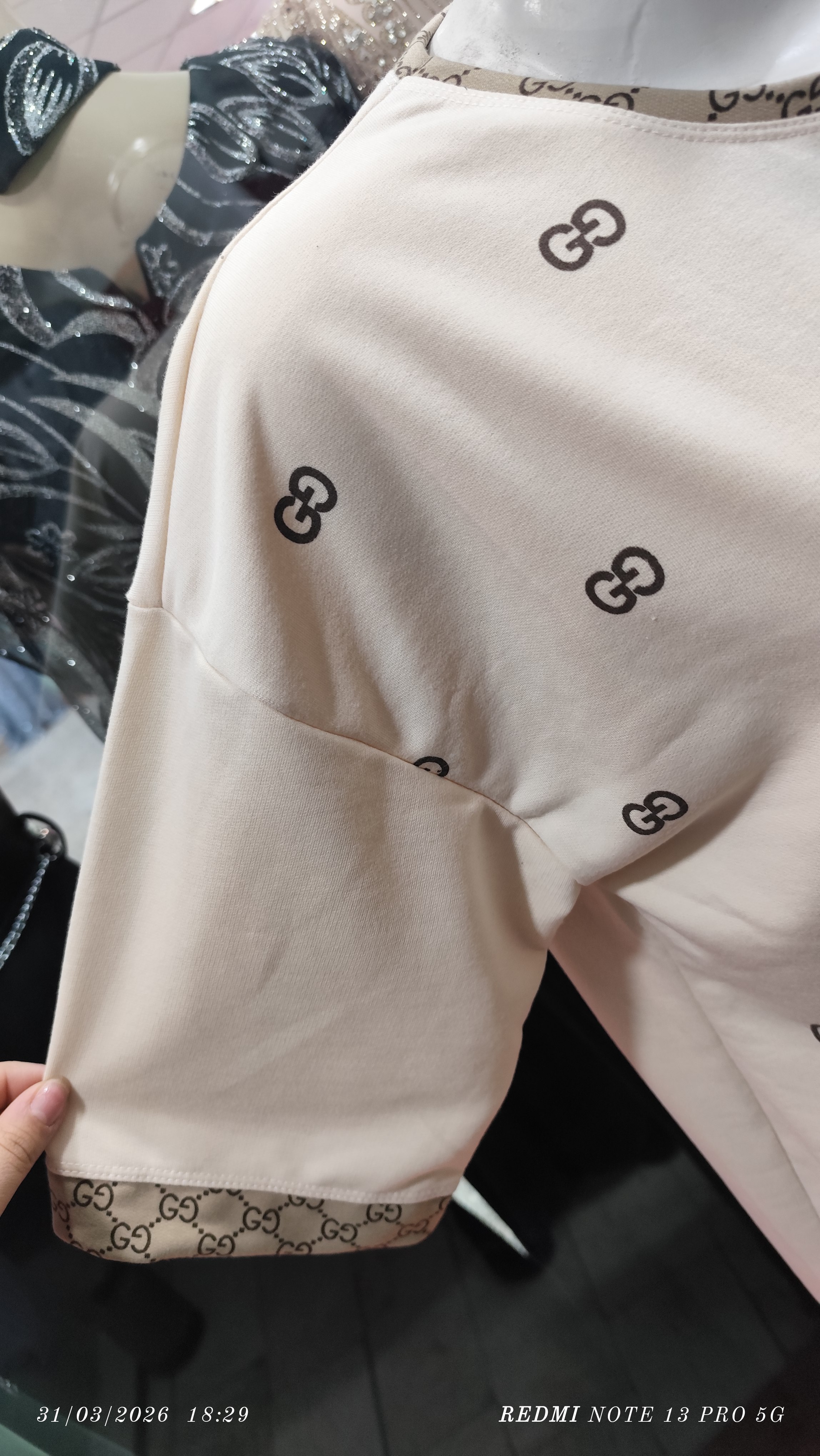 ست تیشرت شلوار گوچی در رنگ کرم نسکافه ای با شلوار یکسان